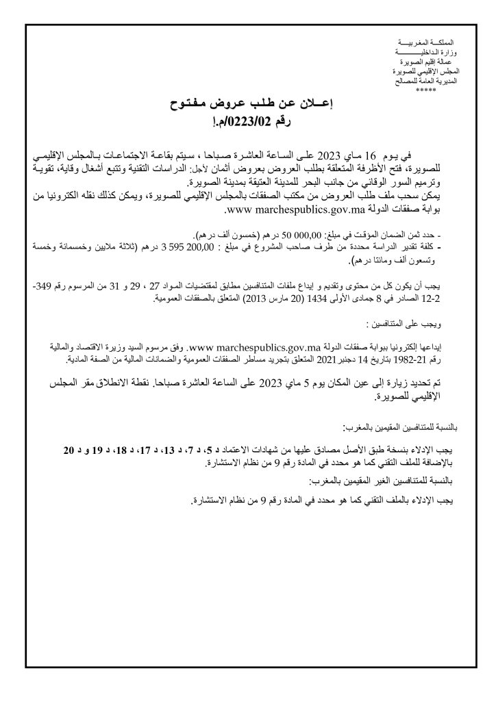 أنشطة المجلس, الصفقات, سلايدرإعلان عن طلب عروض مفتوح – لأجل: الدراسات التقنية وتتبع أشغال وقاية، تقوية وترميم السور الوقائي من جانب البحر للمدينة العتيقة بمدينة الصويرة. هيئة التحرير / 4 مايو، 2023