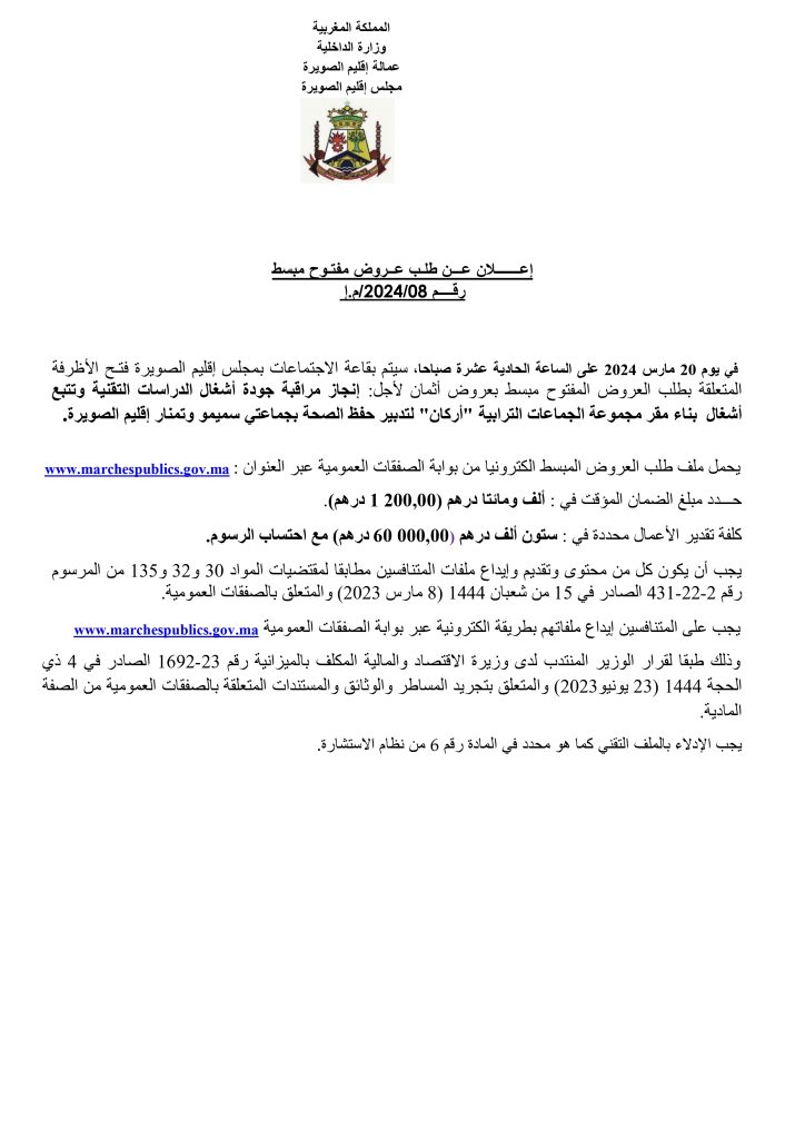 إعلان عن طلب عروض مفتوح مبسط – لأجل: إنجاز مراقبة جودة أشغال الدراسات التقنية وتتبع أشغال بناء مقر مجموعة الجماعات الترابية “أركان” لتدبير حفظ الصحة بجماعتي سميمو وتمنار إقليم الصويرة.