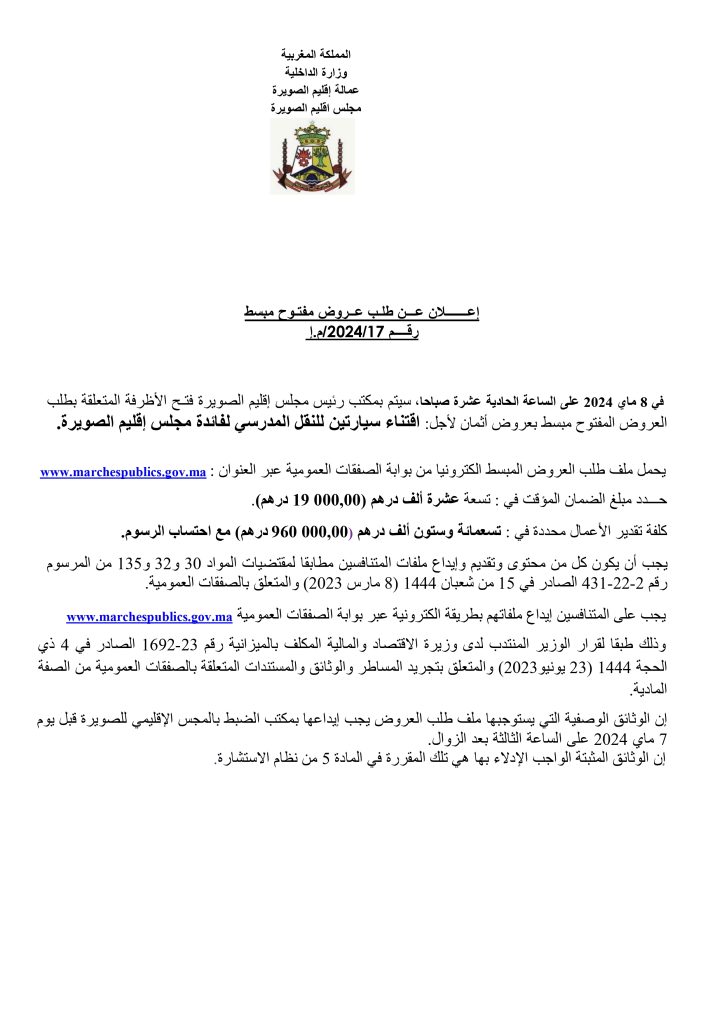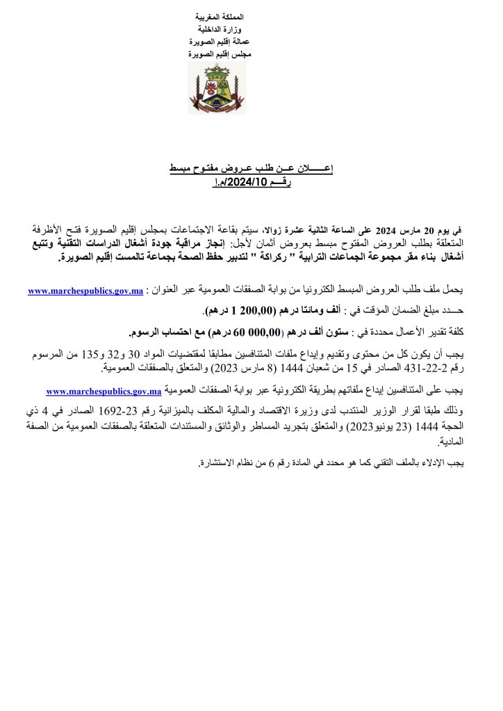 إعلان عن طلب عروض مفتوح مبسط – إنجاز مراقبة جودة أشغال الدراسات التقنية وتتبع أشغال بناء مقر مجموعة الجماعات الترابية “العرعار” لتدبير حفظ الصحة بجماعة الحنشان إقليم الصويرة.