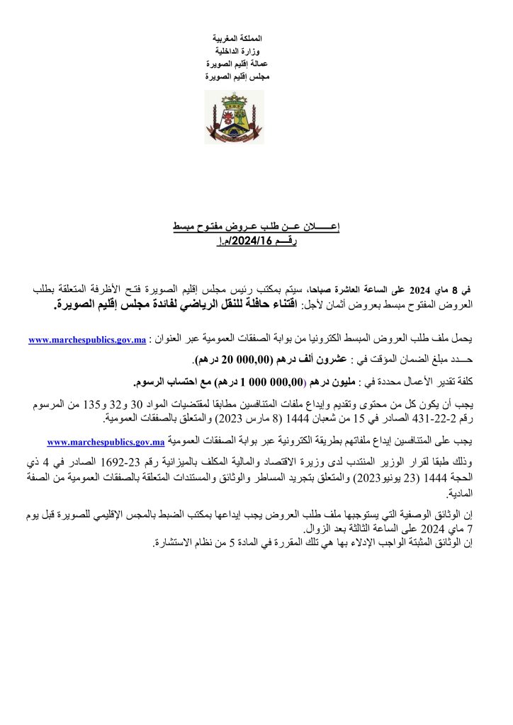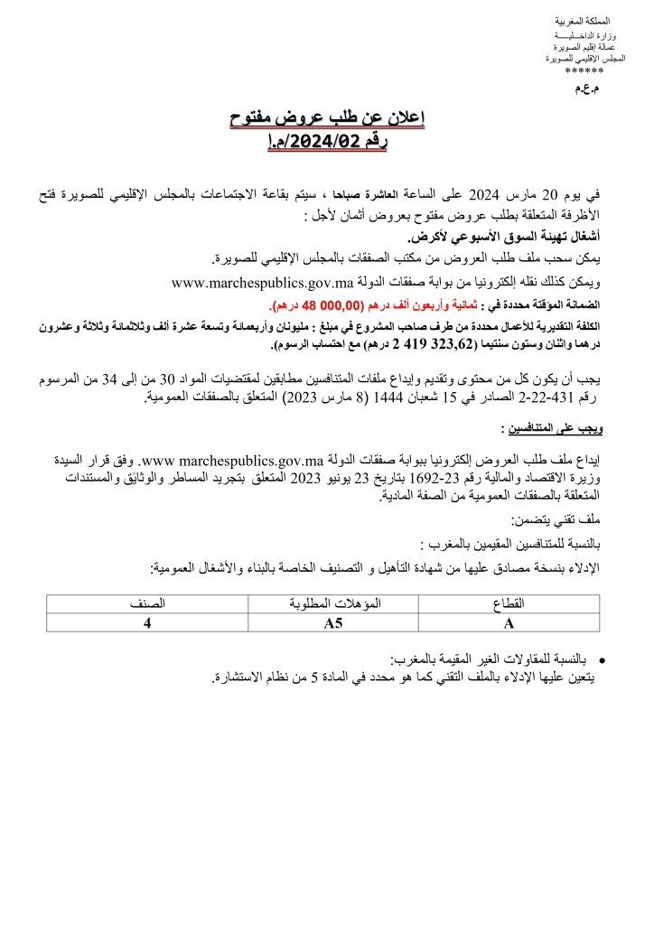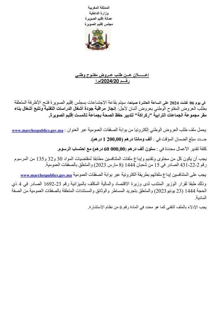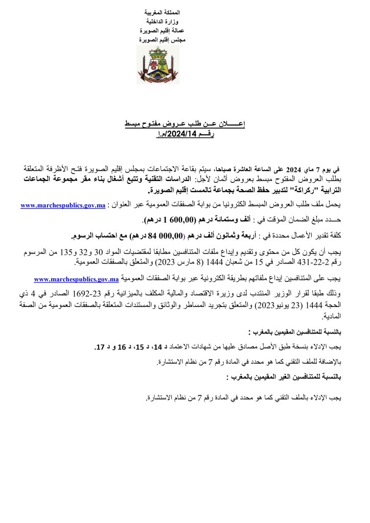 إعلان عن طلب عروض مفتوح مبسط – الدراسات التقنية وتتبع أشغال بناء مقر مجموعة الجماعات الترابية “ركراكة” لتدبير حفظ الصحة بجماعة تالمست إقليم الصويرة.