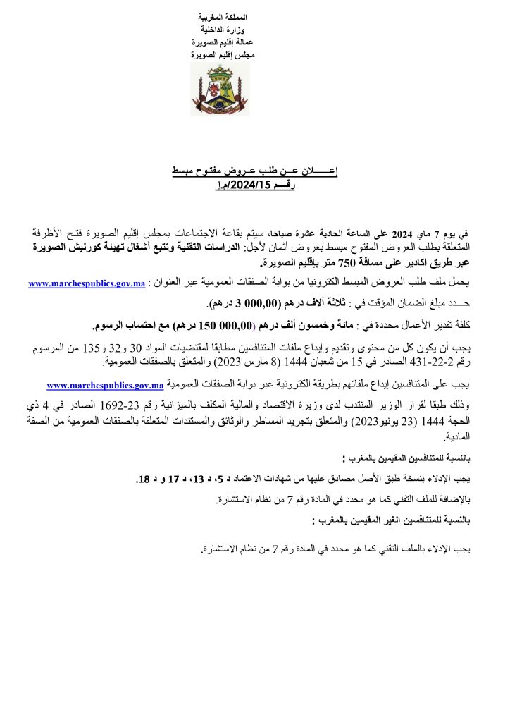 إعلان عن طلب عروض مفتوح مبسط – الدراسات التقنية وتتبع أشغال تهيئة كورنيش الصويرة عبر طريق اكادير على مسافة 750 متر بإقليم الصويرة.