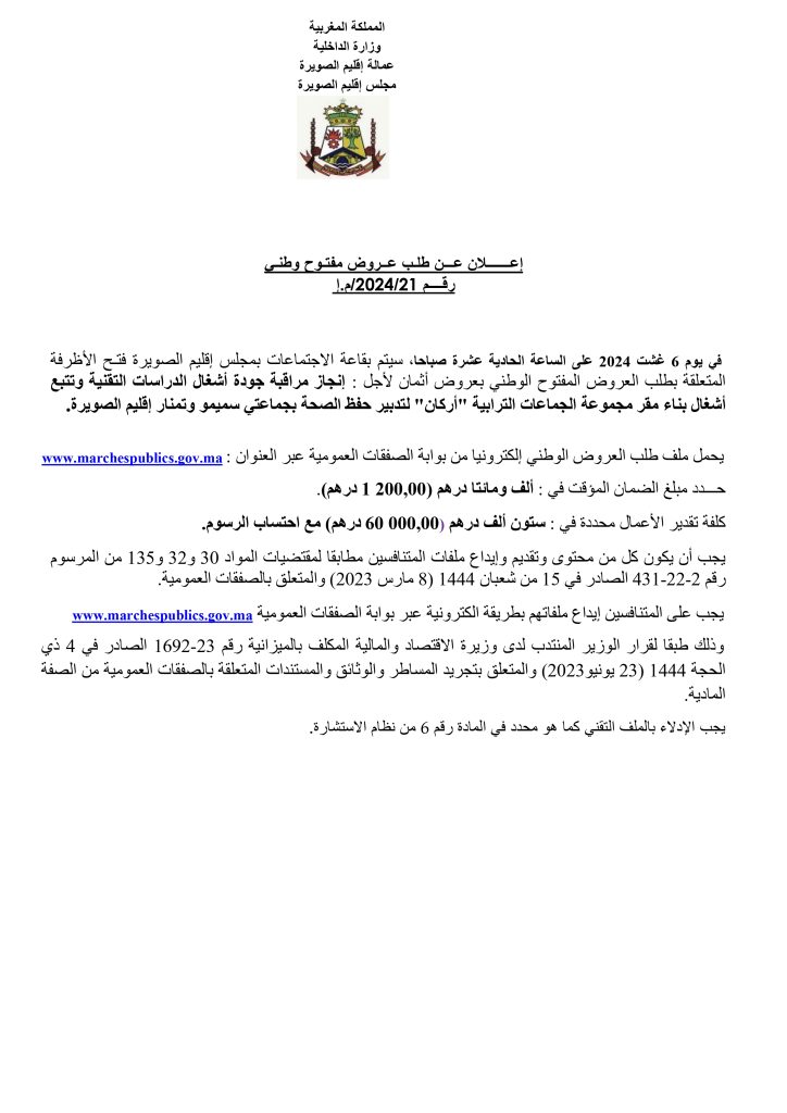 إعلان عن طلب عروض مفتوح وطنى – إنجاز مراقبة جودة أشغال الدراسات التقنية وتتبع أشغال بناء مقر مجموعة الجماعات الترابية “أركان” لتدبير حفظ الصحة بجماعتي سميمو وتمنار إقليم الصويرة.